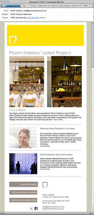 Phorm send out a regular news email displaying their latest work, and one-off seasonal or special event emails. 57 designs all of Phorm's new media output, maintaining their clean, elegant style throughout.